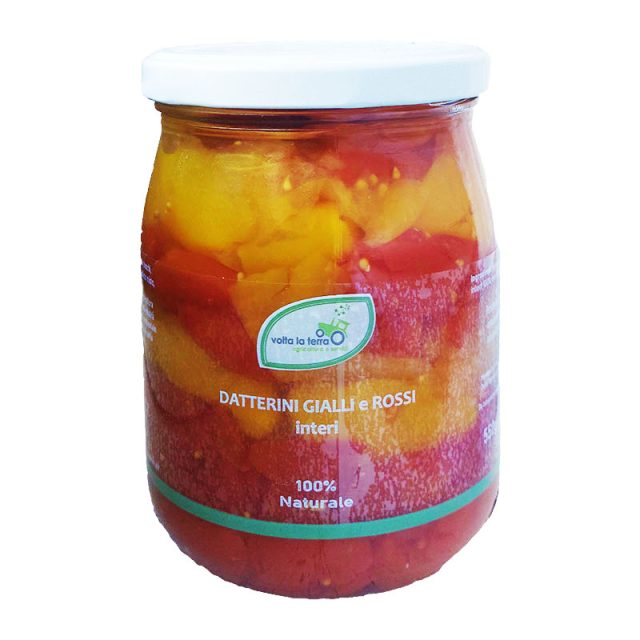 Pomodori datterini gialli e rossi interi con basilico: Pomodori e basilico coltivati da Volta la terra, che segue personalmente l’azienda agricola biologica dal seme alla raccolta, con l’obiettivo di produrre sempre con un alto standard di qualità.